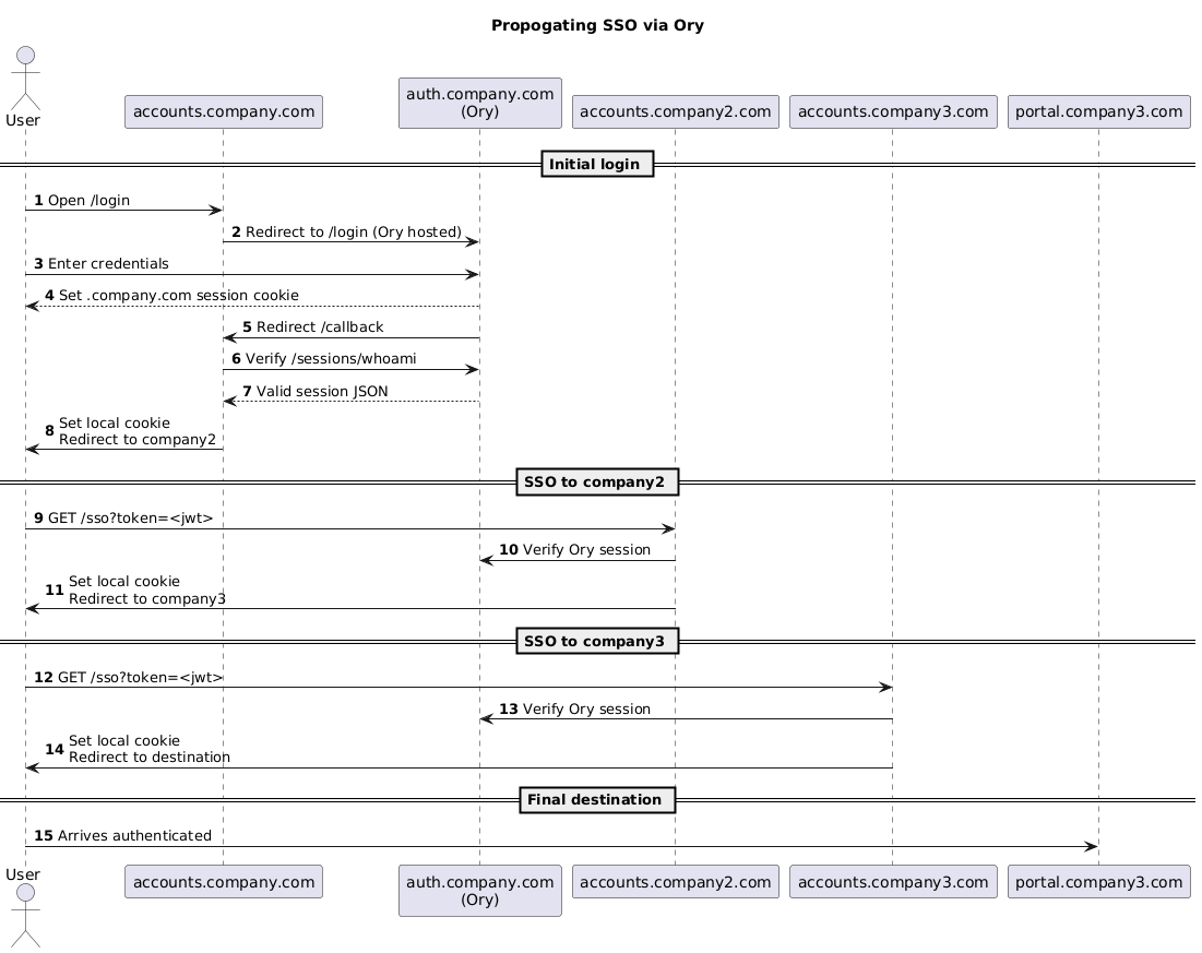 Since users routinely navigated to https://accounts.company.com to initiate login, that entry point was preserved. Its new responsibility was simply to redirect to Ory, handle callback flows, and initiate the cross-domain SSO propagation sequence.